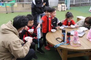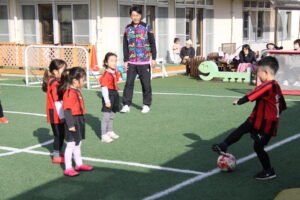 本江JFCは、心身共に健全で明るい子どもの育成を目指し、コーチや先生、そしてお友達と 一緒にサッカーを楽しもうと結成されました。 芝生の園庭で思いっきり走ってボールを追いかけましょう! 興味のある方はお気軽にご参加ください。